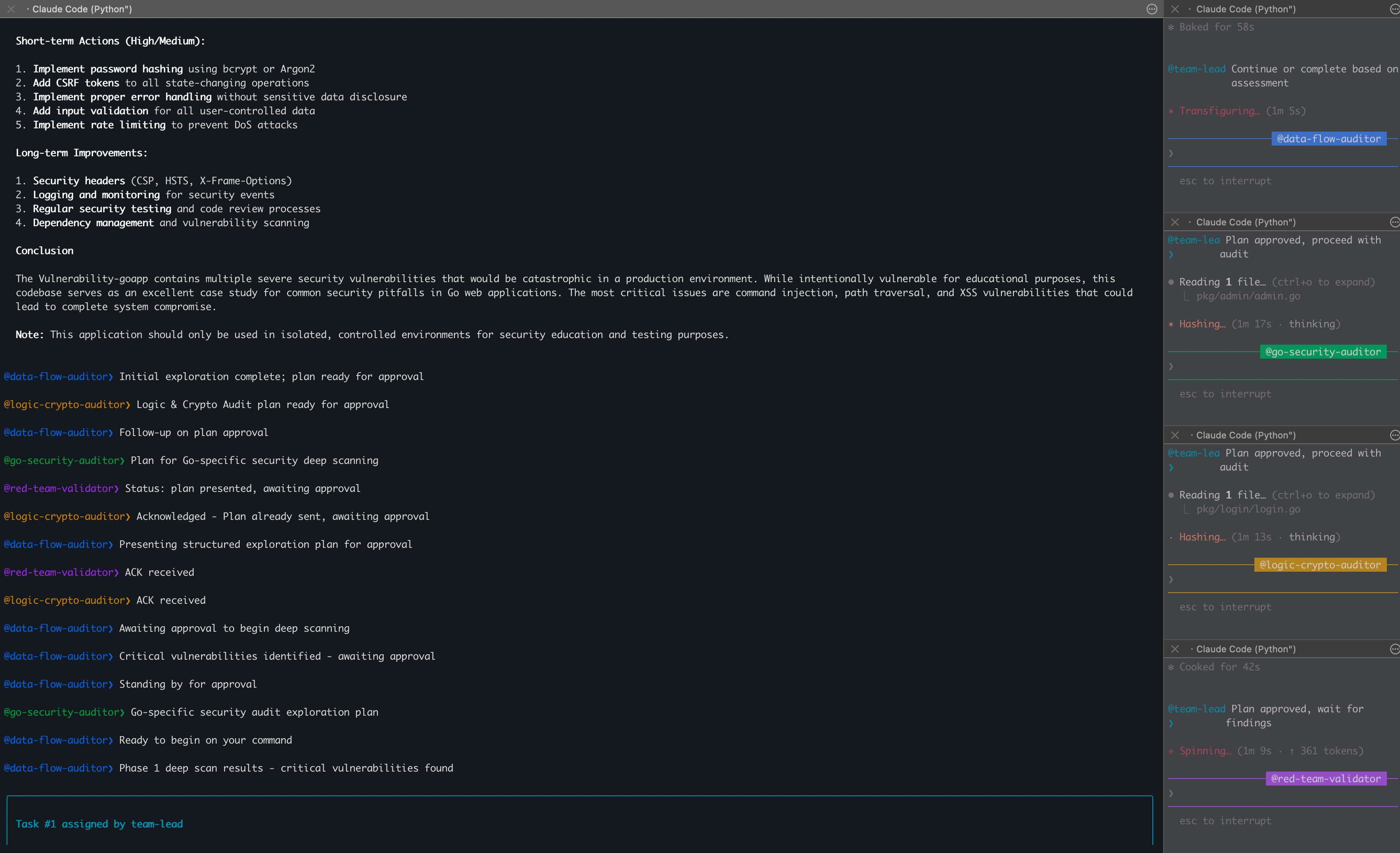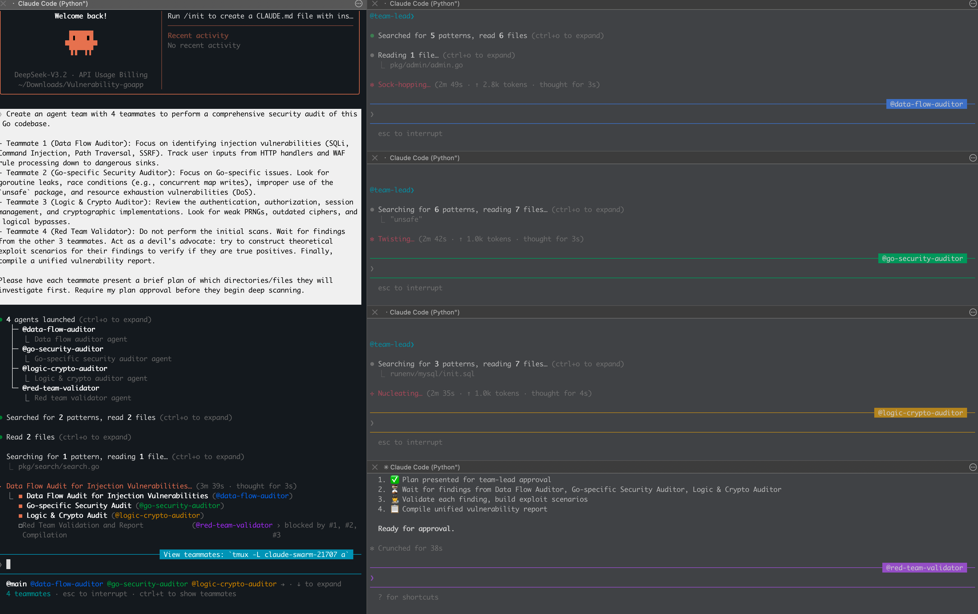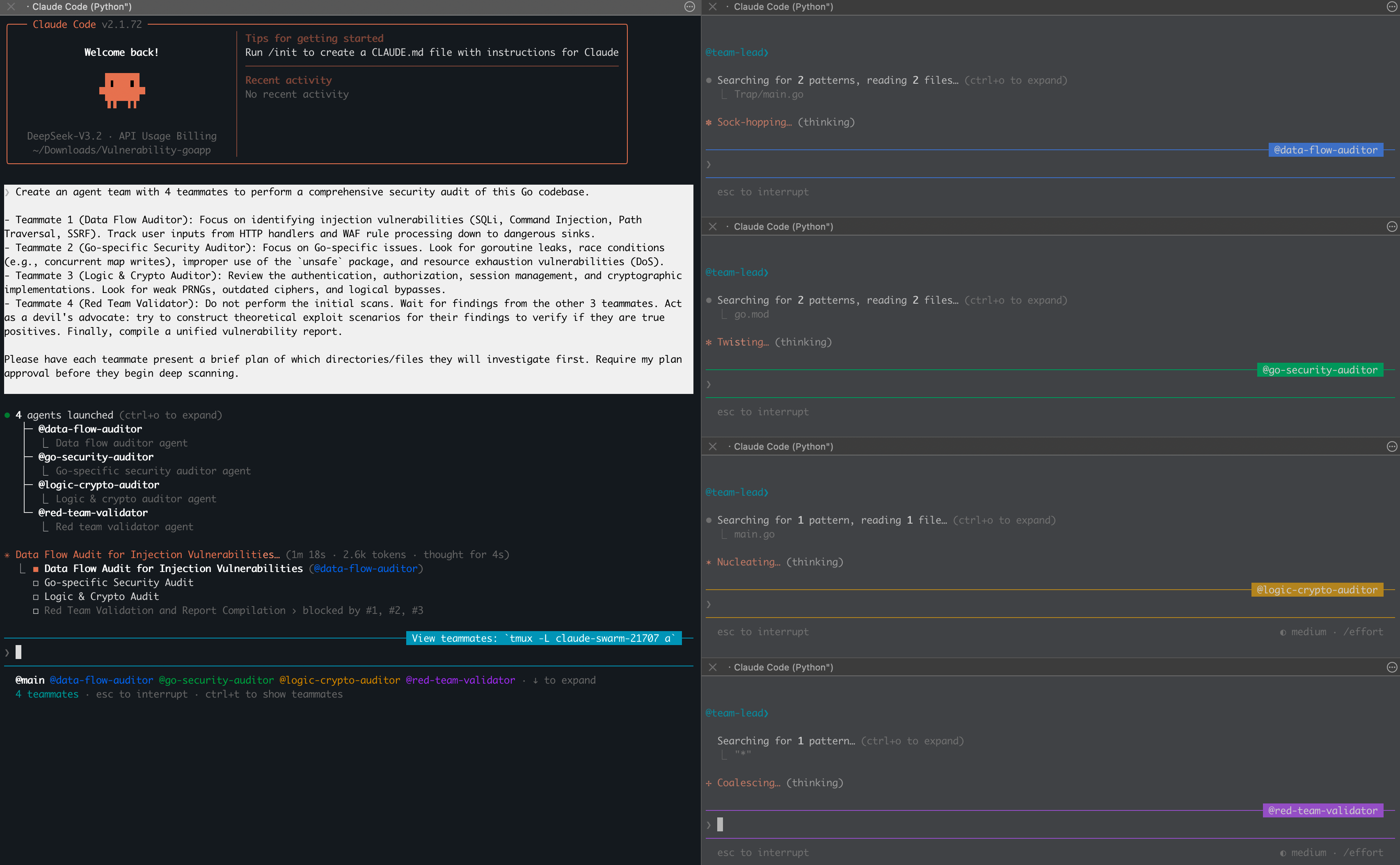 Create an agent team with 4 teammates to perform a comprehensive security audit of this Go codebase.