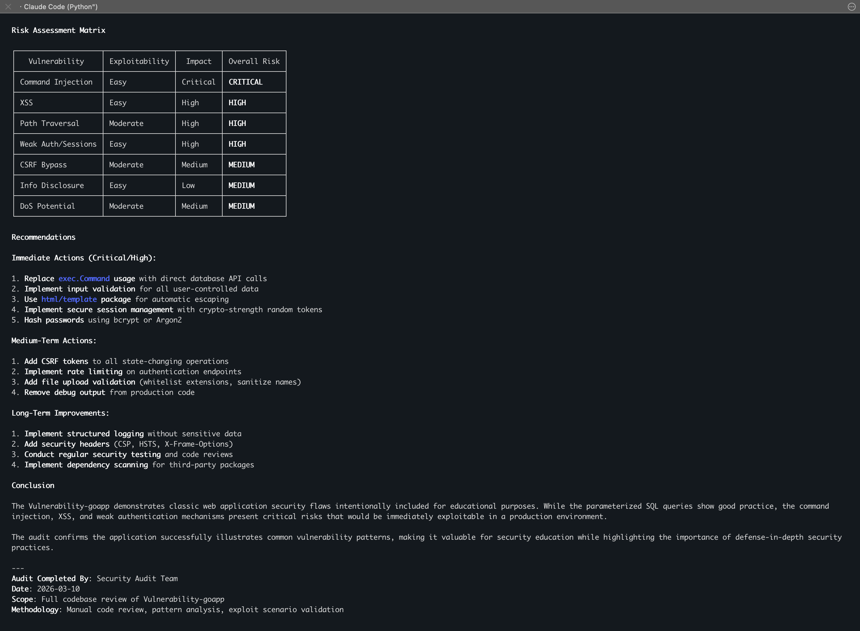 math/rand生成弱随机数会话。 - Go-Specific Auditor (Go 语言专项) 检查了 Goroutine 和资源耗尽问题,虽然这个靶场没用到并发(“No Goroutine Leaks: Application doesn’t use concurrency”),但它尽职地指出了无限制加载所有帖子的潜在 DoS (拒绝服务) 风险。