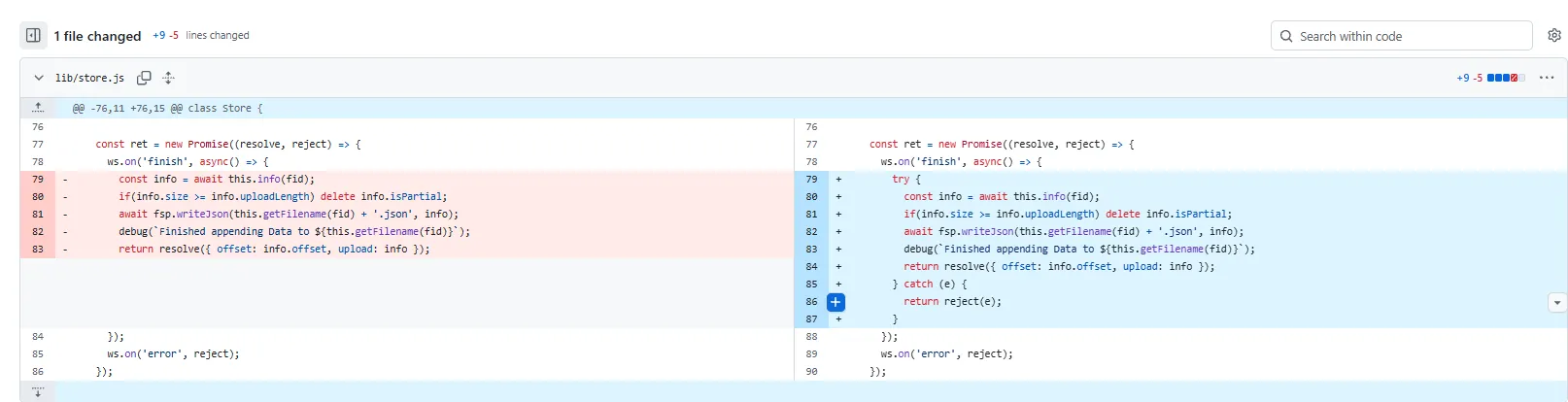 The vulnerability is located in lib/store.js. When the server processes an upload via the tus protocol, it listens for the finish event on the write stream. Inside this event listener, it attempts to retrieve file metadata using this.info(fid).