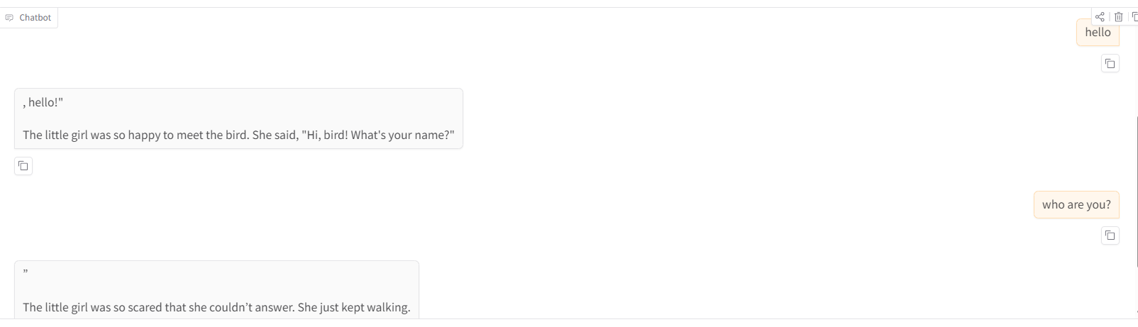 def predict(message): model_inputs = tokenizer.encode(message, return_tensors="pt") model_outputs = model.generate( model_inputs, max_new_tokens=30, num_beams=1, pad_token_id=tokenizer.eos_token_id, ) model_outputs = model_outputs[0, len(model_inputs[0]):] model_output_text = tokenizer.decode( model_outputs, skip_special_tokens=True) return model_output_text