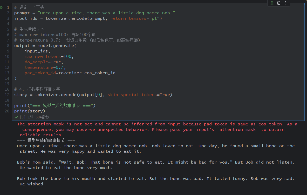 print("=== 1. 完整故事翻译 ===")# decode 是核心函数:把数字变回文字text = tokenizer.decode(ids, skip_special_tokens=True)print(text)